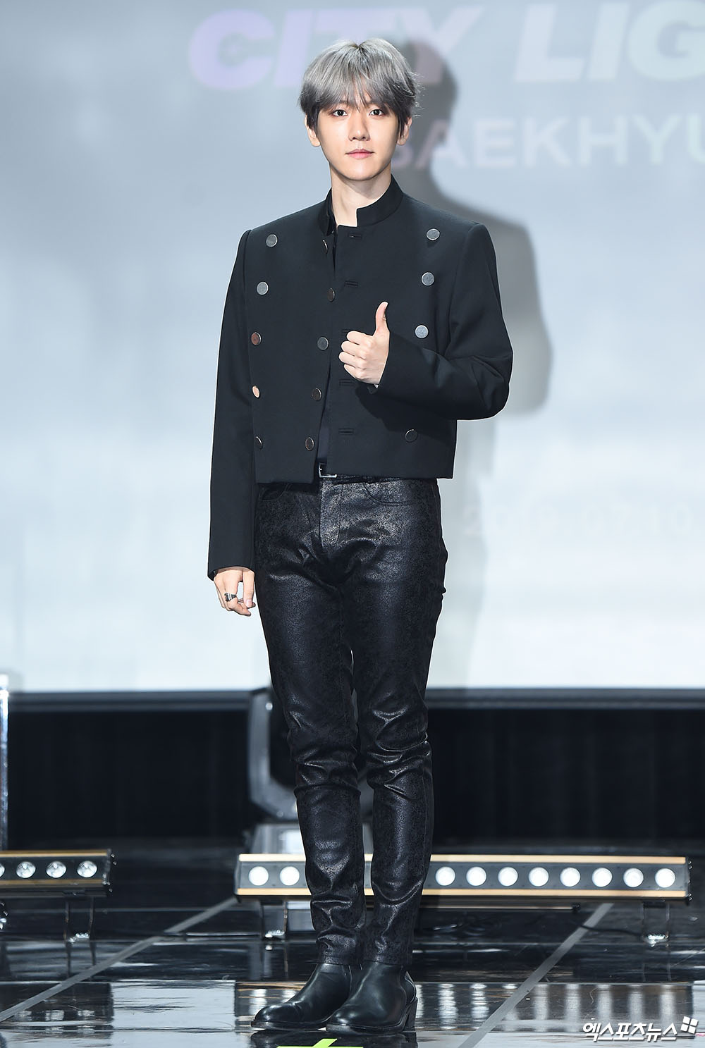 [엑스포츠뉴스 박지영 기자] 10일 오후 서울 삼성동 SAC 아트홀에서 엑소 백현 첫 솔로 앨범 'City Lights' 발매 기념 쇼케이스가 열렸다. 이날 쇼케이스에 참석한 엑소 백현이 포즈를 취하고 있다.