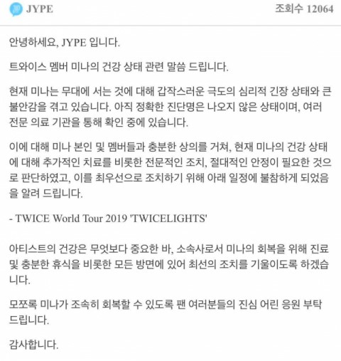 안녕하세요, JYPE 입니다. 트와이스 멤버 미나의 건강 상태 관련 말씀 드립니다.