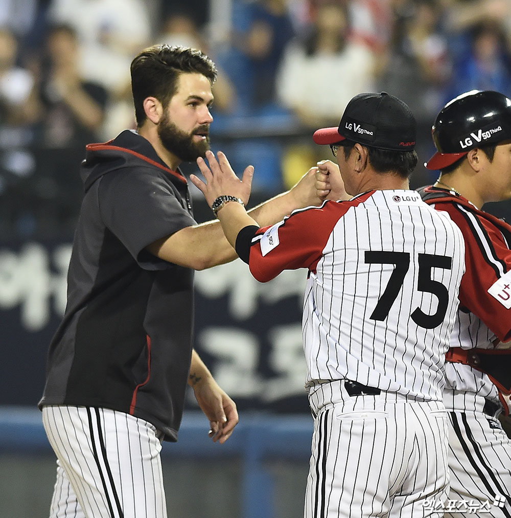 경기 종료 후 LG 켈리가 류중일 감독과 하이파이브를 나누고 있다.