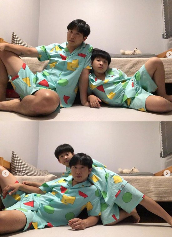 공개된 사진 속 유세윤은 아들과 함께 커플 잠옷을 입고 카메라 앞에서 포즈를 취하고 있다.