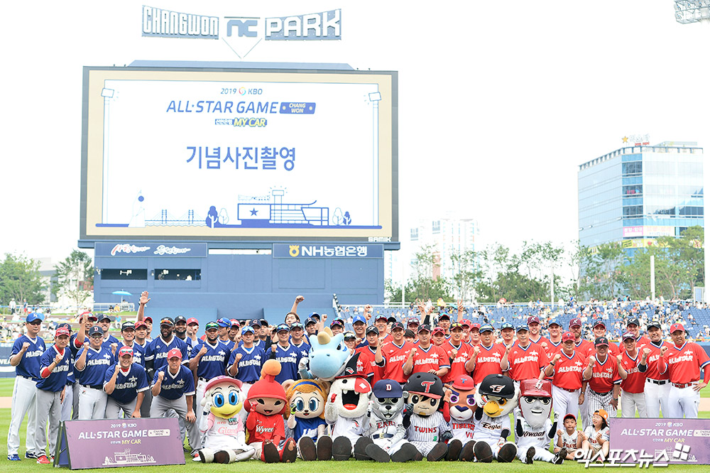 [엑스포츠뉴스 창원, 김한준 기자] 21일 오후 경상남도 창원NC파크에서 열린 '2019 KBO 올스타전' 드림 올스타와 나눔 올스타의 경기, KBO 올스타 선수 및 코칭스태프가 기념촬영을 갖고 있다.