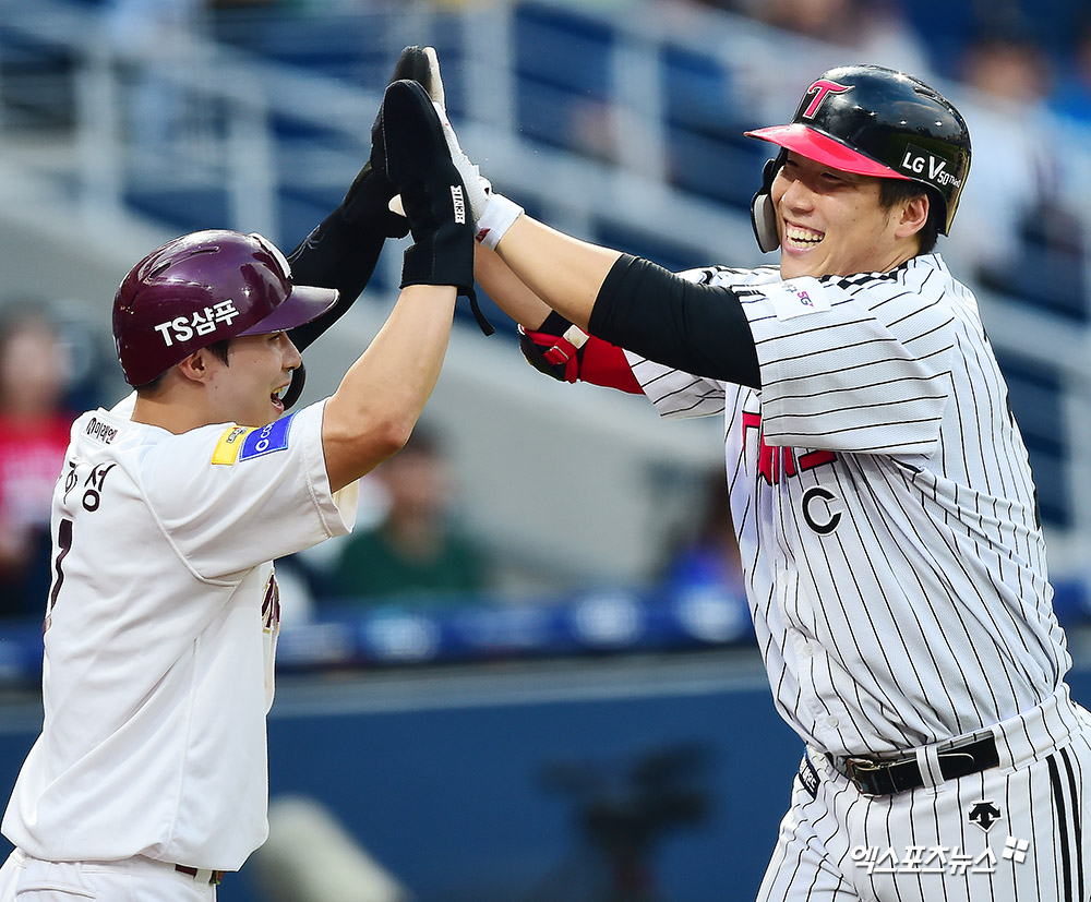 [엑스포츠뉴스 창원, 김한준 기자] 21일 오후 경상남도 창원NC파크에서 열린 '2019 KBO 올스타전' 드림 올스타와 나눔 올스타의 경기, 4회말 무사 1루 나눔올스타 김현수가 동점 투런 홈런을 날린 후 김하성과 하이파이브를 하고 있다.