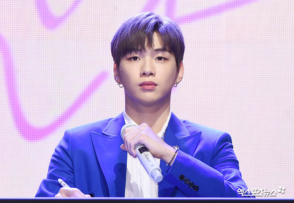 [엑스포츠뉴스 윤다희 기자] 25일 오후 서울 광장동 예스24라이브홀에서 열린 가수 강다니엘(KANG DANIEL) 데뷔 앨범 '컬러 온 미'(color on me)' 발매 기념 쇼케이스에 참석한 강다니엘이 질의응답 시간을 갖고 있다.