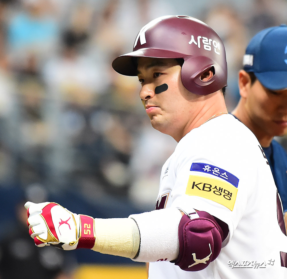 [엑스포츠뉴스 고척, 김한준 기자] 27일 오후 서울 구로구 고척스카이돔에서 열린 '2019 신한은행 MY CAR KBO리그 NC 다이노스와 키움 히어로즈의 경기, 1회말 2사 1루 키움 박병호가 우전안타를 날린 후 귀루하고 있다.