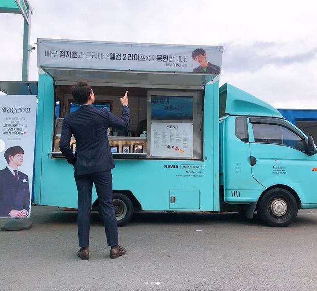 [엑스포츠뉴스 김예은 기자] 배우 이정재가 정지훈의 드라마 촬영장에 커피차를 보냈다.