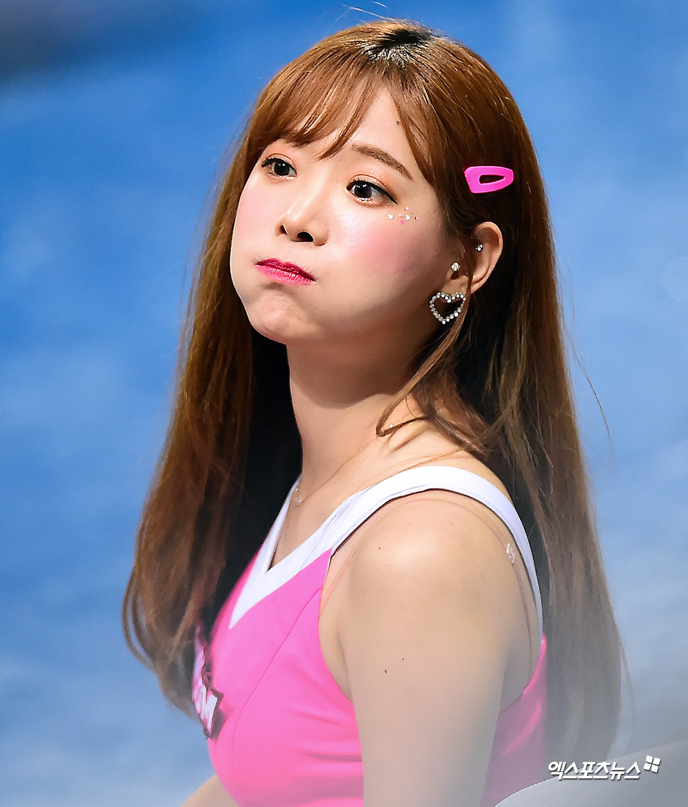 [엑스포츠뉴스 고척, 김한준 기자]10일 오후 서울 구로구 고척스카이돔에서 열린 '2019 신한은행 MY CAR KBO리그 두산 베어스와 키움 히어로즈의 경기, 키움 치어리더 김한나가 장난스러운 표정을 보이고 있다.