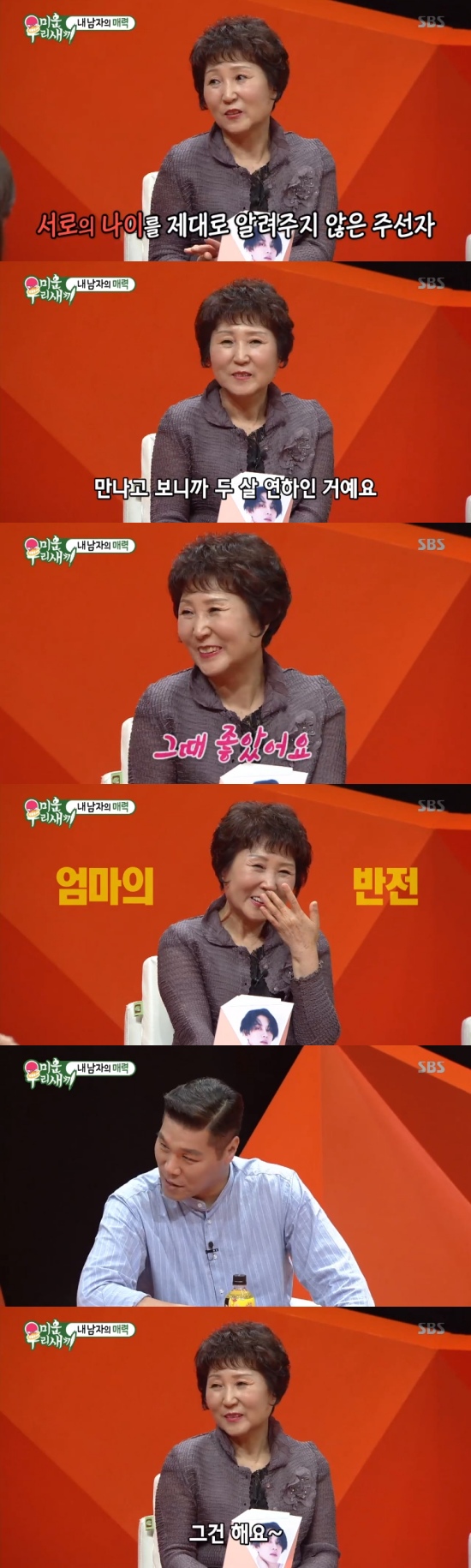 이날 김희철 어머니는 김희철 아버지가 2살 연하라고 밝혔고, "저도 연하 싫었다. 소개해주는 사람이 나이를 알려주지 않았다. 만나고 나서 알았다. 그때 좋았다"라며 털어놨다.
