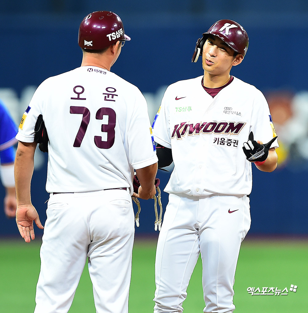 [엑스포츠뉴스 고척, 김한준 기자] 6일 오후 서울 구로구 고척스카이돔에서 열린 '2019 신한은행 MY CAR KBO리그' 삼성 라이온즈와 키움 히어로즈의 경기, 4회말 키움 이정후가 2루타를 날린 후 오윤 코치와 대화를 나누고 있다.