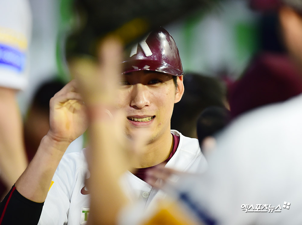 [엑스포츠뉴스 고척, 김한준 기자] 6일 오후 서울 구로구 고척스카이돔에서 열린 '2019 신한은행 MY CAR KBO리그' 삼성 라이온즈와 키움 히어로즈의 경기, 6회말 1사 만루 키움 이정후가 김혜성의 3타점 2루타때 득점에 성공한 후 더그아웃에서 하이파이브를 하고 있다.
