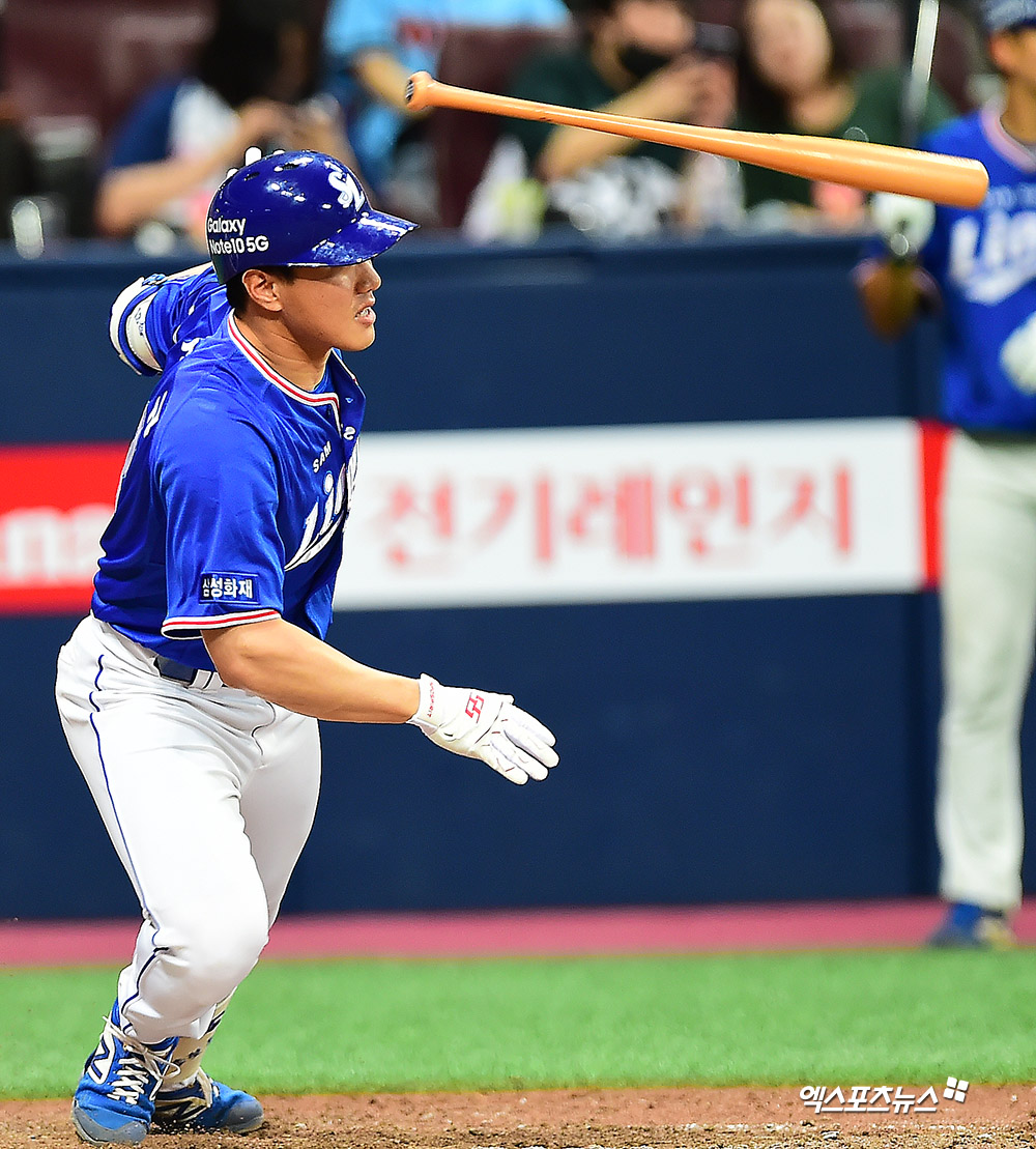 [엑스포츠뉴스 고척, 김한준 기자] 6일 오후 서울 구로구 고척스카이돔에서 열린 '2019 신한은행 MY CAR KBO리그' 삼성 라이온즈와 키움 히어로즈의 경기, 8회초 1사 삼성 이성규가 좌전안타를 날리고 있다.