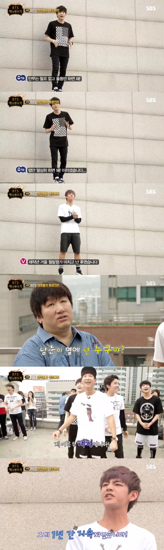 또 뷔는 "재작년 월말 평가 때였다. 랩몬 형과 편의점에 가고 있었다. 방시혁 PD님을 마주쳤다. '남준이 옆에 넌 누군'라고 했다. 제 이름은 태형이다. 제 이름을 외워달라"라며 호소했다. 이에 방시혁 PD는 "내가 잘못했다. 끝까지 살아남아서 뷔라는 제대로 된 이름도 얻고 고맙다"라며 응원했다.