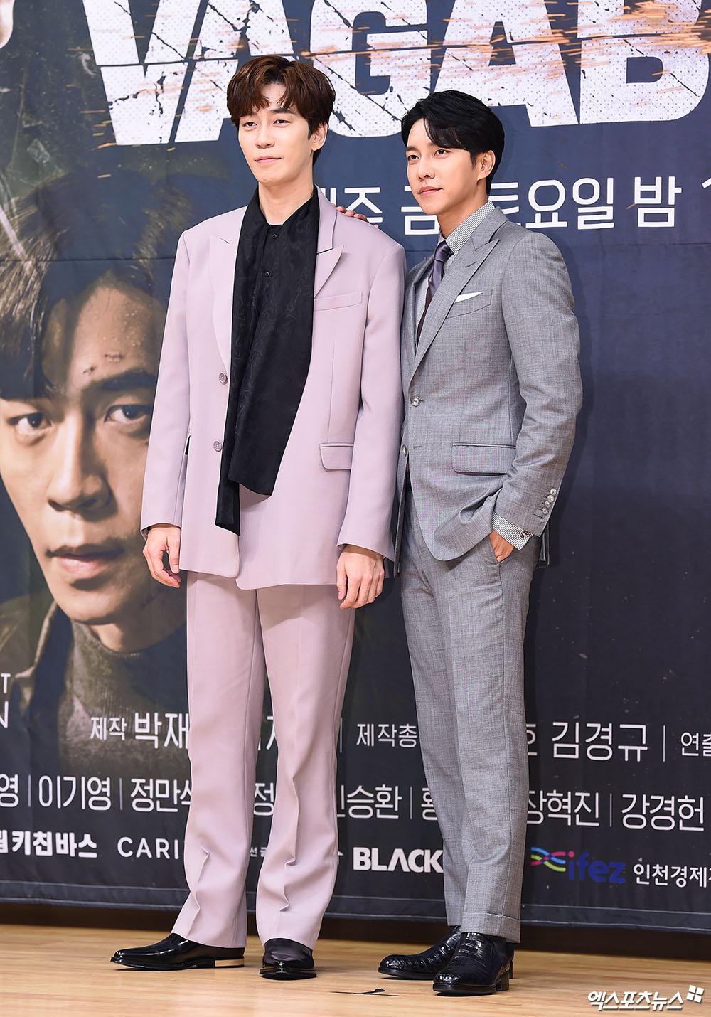 [엑스포츠뉴스 박지영 기자] 16일 오후 서울 목동 SBS에서 열린 SBS 새 금토드라마 '배가본드' 제작발표회에 참석한 배우 신성록, 이승기가 포토타임을 갖고 있다.