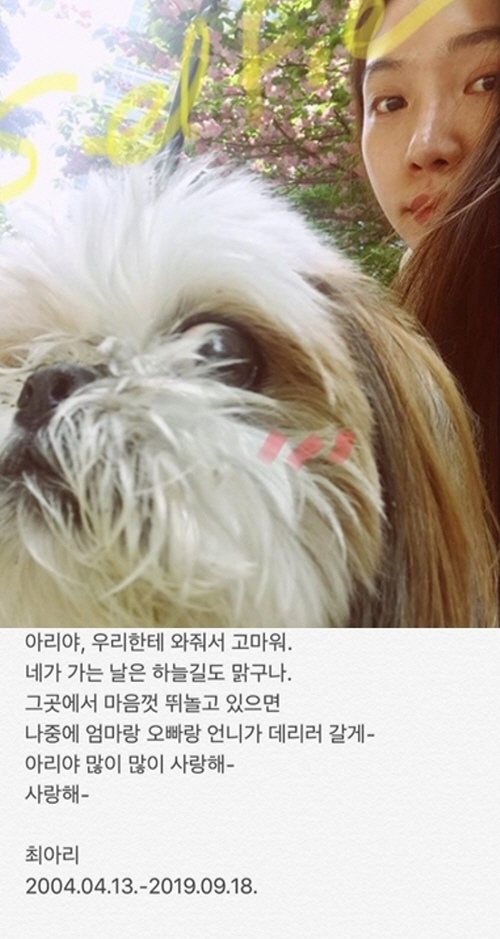사진에는 반려견 아리에게 보내는 편지가 담겨 있다. "아리야 우리에게 와줘 고마워. 네가 가는 날은 하늘길도 맑구나. 그곳에서 마음껏 뛰놀고 있으면 나중에 엄마랑 오빠랑 언니가 데리러 갈게. 아리야 많이 많이 사랑해 사랑해"라는 글을 적었다.