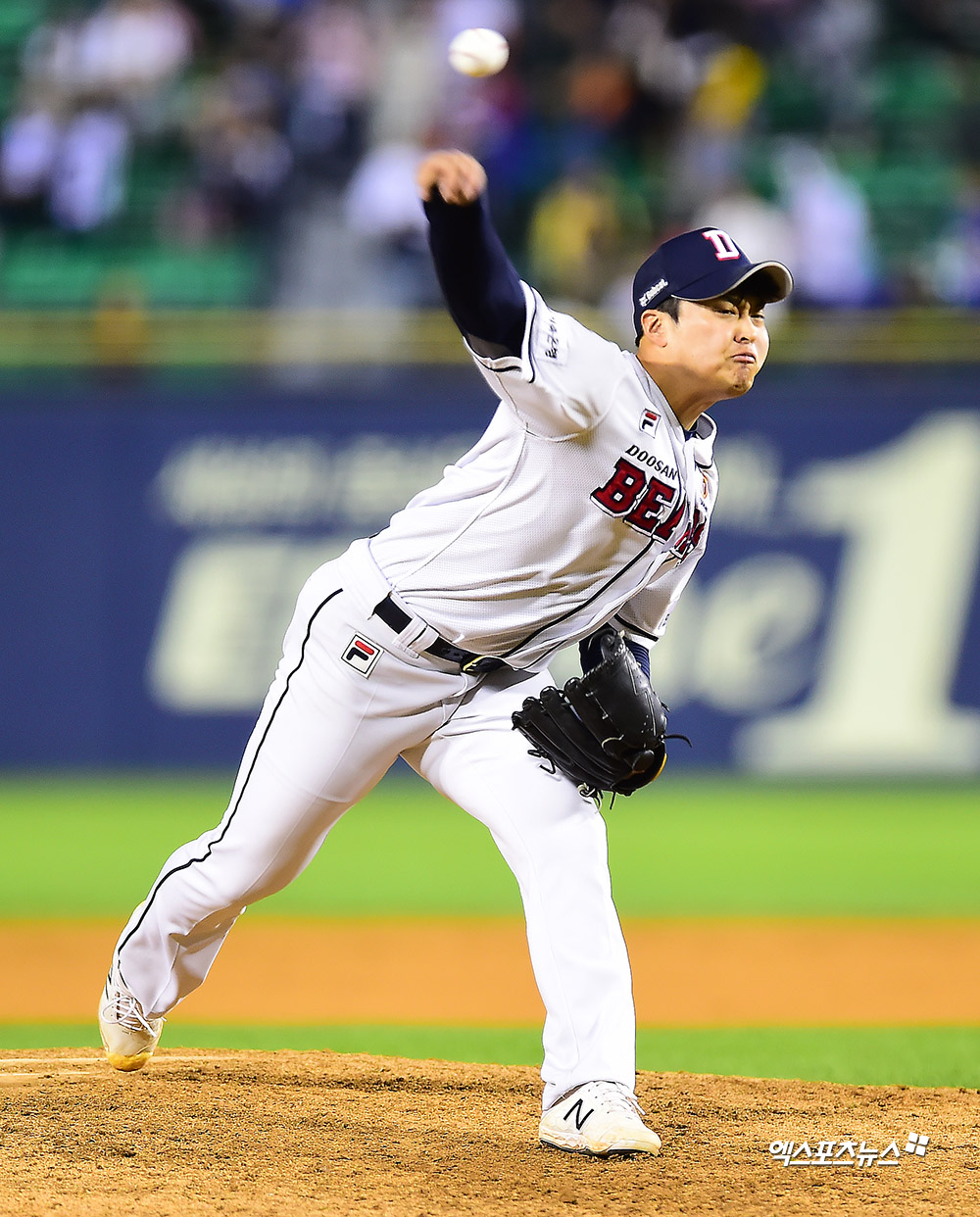9회초 두산 이형범이 공을 힘차게 던지고 있다.