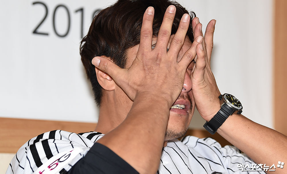 [엑스포츠뉴스 잠실, 박지영 기자] 29일 오후 서울 송파구 잠실야구장에서 열리는 '2019 신한은행 MY CAR KBO리그' 두산 베어스와 LG 트윈스의 경기에 앞서 LG 이동현 은퇴 기자회견이 진행됐다. 기자회견에 참석한 이동현이 취재진의 질문에 답하던 중 눈물을 보이고 있다.