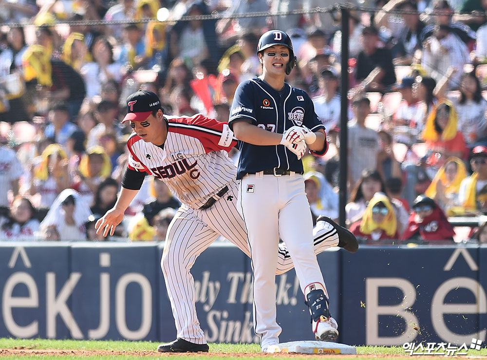 [엑스포츠뉴스 잠실, 박지영 기자] 29일 오후 서울 송파구 잠실야구장에서 열린 '2019 신한은행 MY CAR KBO리그' 두산 베어스와 LG 트윈스의 경기, 4회초 무사 1루 두산 박건우가 유격수 앞 땅볼로 출루한 뒤 1루에서 LG 1루수 김현수에게 태그아웃되고 있다.