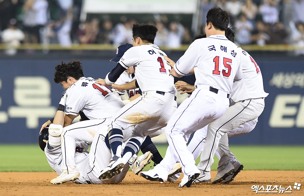 [엑스포츠뉴스 잠실, 박지영 기자] 1일 오후 서울 송파구 잠실야구장에서 열린 '2019 신한은행 MY CAR KBO리그' NC 다이노스와 두산 베어스의 경기, 두산 베어스가 치열한 접전 끝에 9회말 터진 박세혁의 끝내기 안타로 NC 다이노스에게 6:5의 스코어로 승리를 거두며 정규 시즌 우승을 확정했다.