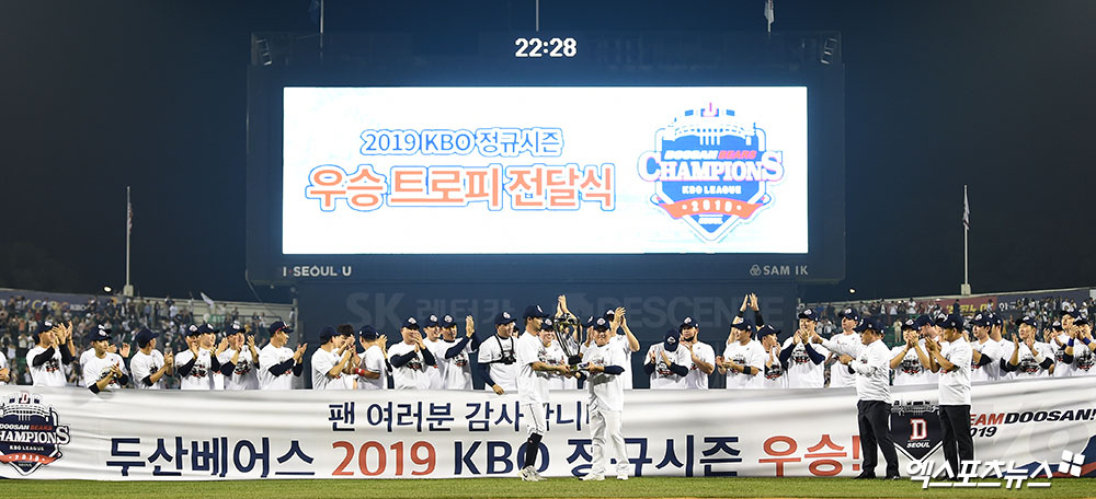 [엑스포츠뉴스 잠실, 박지영 기자] 1일 오후 서울 송파구 잠실야구장에서 열린 '2019 신한은행 MY CAR KBO리그' NC 다이노스와 두산 베어스의 경기, 두산 베어스가 치열한 접전 끝에 9회말 터진 박세혁의 끝내기 안타로 NC 다이노스에게 6:5의 스코어로 승리를 거두며 정규 시즌 우승을 확정했다.