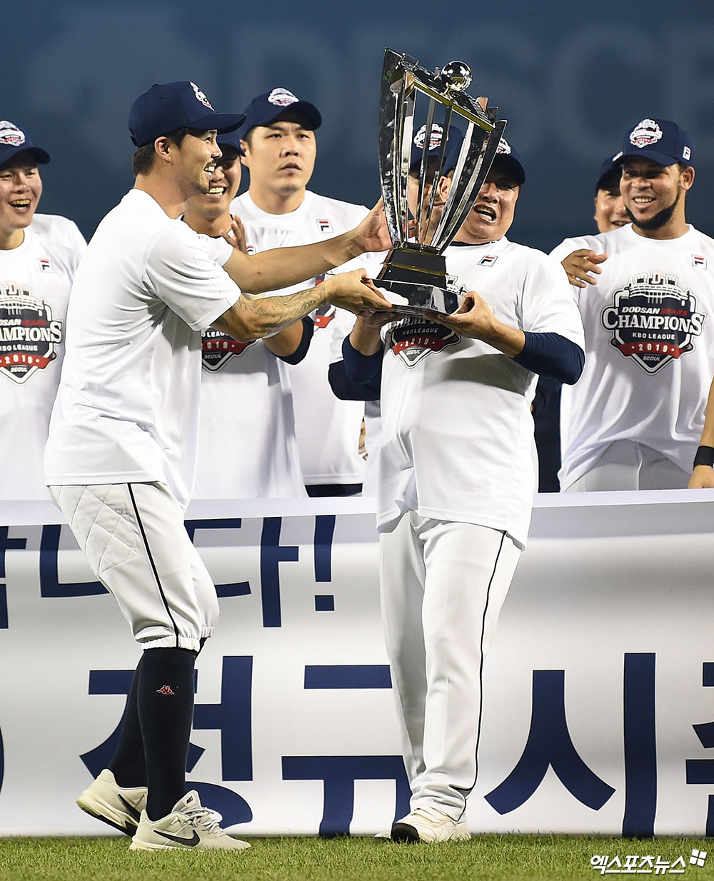 경기 종료 후 두산 선수단이 정규 시즌 우승 세리머니를 하고 있다.