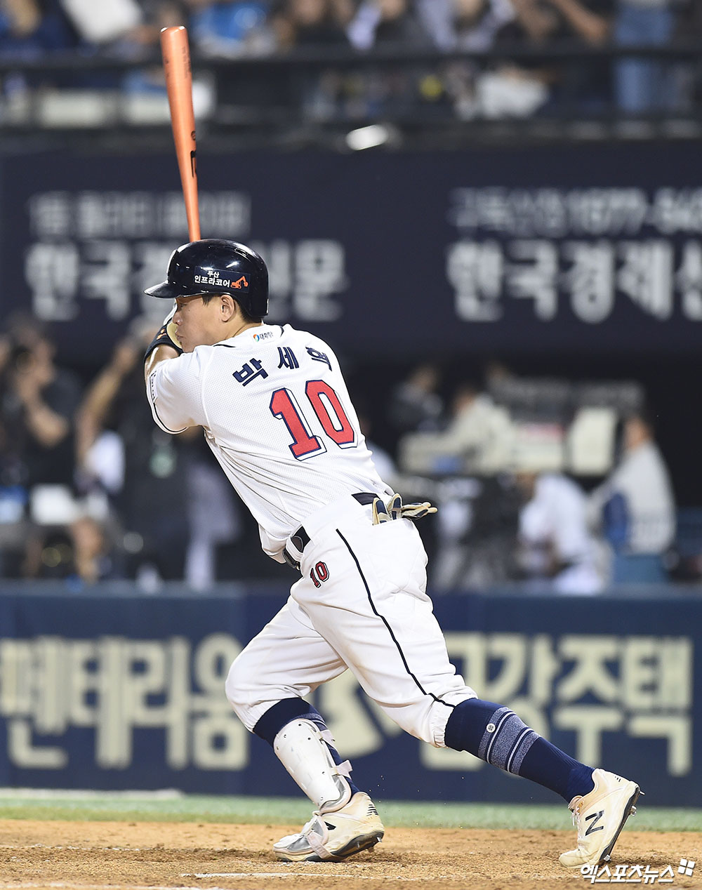 9회말 1사 2루 두산 박세혁이 끝내기 안타를 때려내고 있다.