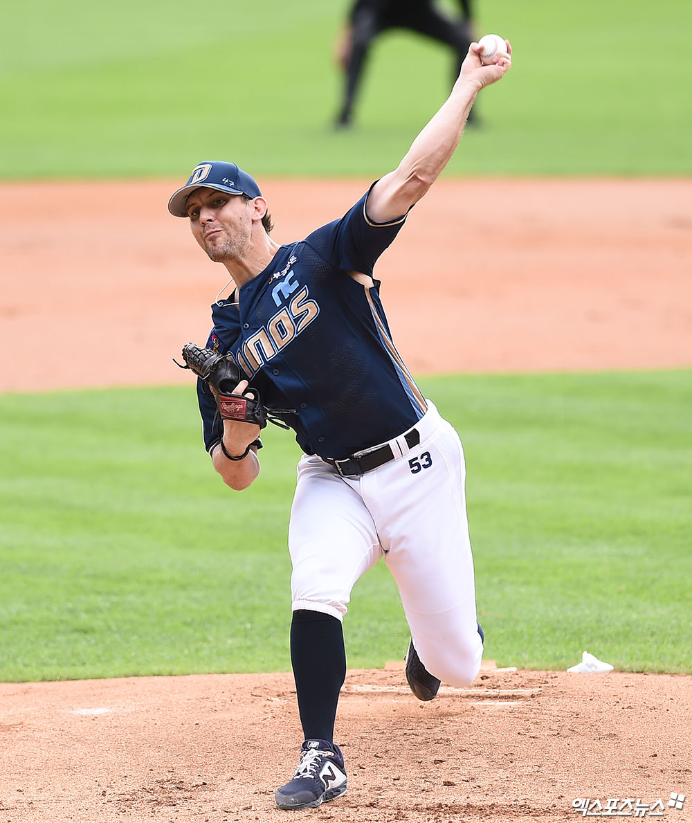 [엑스포츠뉴스 잠실, 박지영 기자] 3일 오후 서울 송파구 잠실야구장에서 열린 '2019 신한은행 MY CAR KBO 포스트시즌' NC 다이노스와 LG 트윈스의 와일드카드 결정전 1차전 경기, 1회말 무사 NC 선발투수 프리드릭이 역투하고 있다.