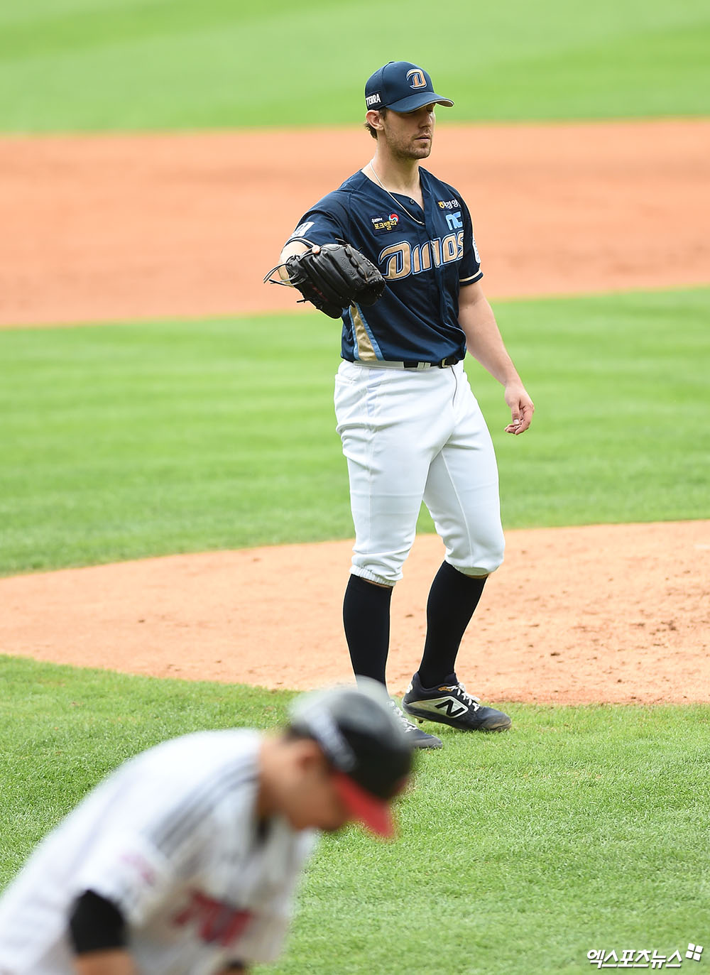 [엑스포츠뉴스 잠실, 박지영 기자] 3일 오후 서울 송파구 잠실야구장에서 열린 '2019 신한은행 MY CAR KBO 포스트시즌' NC 다이노스와 LG 트윈스의 와일드카드 결정전 1차전 경기, 3회말 2사 1,2루 NC 선발투수 프리드릭이 LG 김민성에게 볼넷을 허용하며 만루 위기를 맞고 있다.