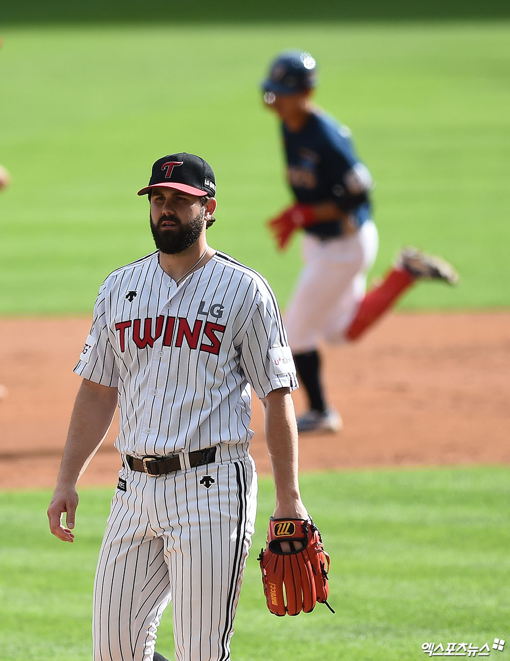 [엑스포츠뉴스 잠실, 박지영 기자] 3일 오후 서울 송파구 잠실야구장에서 열린 '2019 신한은행 MY CAR KBO 포스트시즌' NC 다이노스와 LG 트윈스의 와일드카드 결정전 1차전 경기, 5회초 1사 LG 선발투수 켈리가 NC 노진혁에게 솔로 홈런을 허용한 뒤 아쉬워하고 있다.