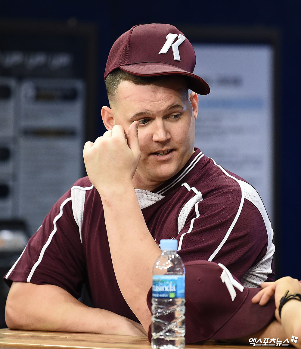 [엑스포츠뉴스 고척, 박지영 기자] 7일 오후 서울 구로구 고척스카이돔에서 열리는 '2019 신한은행 MY CAR KBO 포스트시즌' LG 트윈스와 키움 히어로즈의 준플레이오프 2차전 경기에 앞서 키움 샌즈가 더그아웃에서 동료들과 이야기를 나누고 있다.