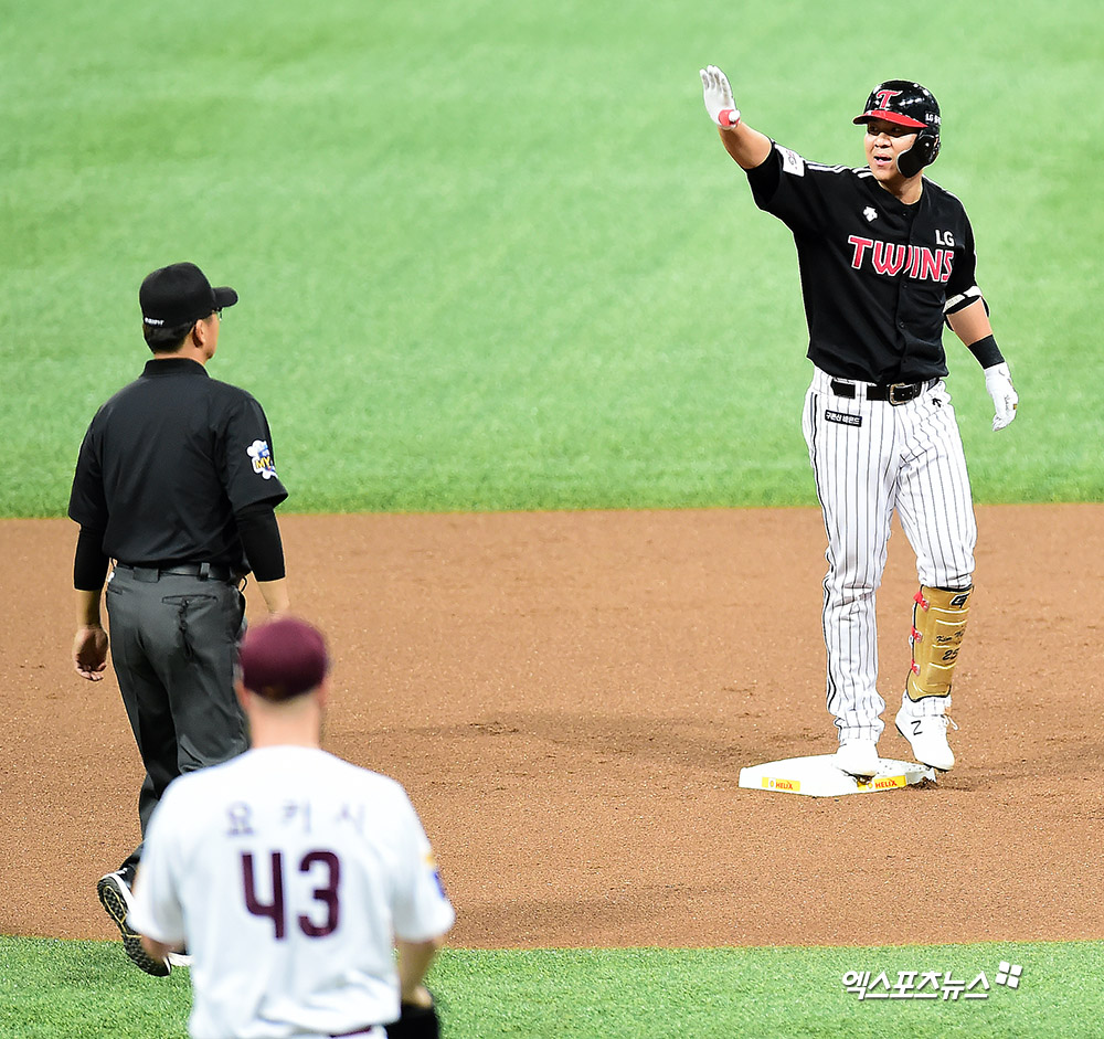 [엑스포츠뉴스 고척, 김한준 기자] 7일 오후 서울 구로구 고척스카이돔에서 열린 '2019 신한은행 MY CAR KBO 포스트시즌' LG 트윈스와 키움 히어로즈의 준플레이오프 2차전 경기, 1회초 1사 LG 김민성이 2루타를 날린 후 세리머니를 하고 있다.