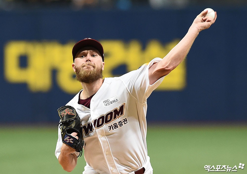 [엑스포츠뉴스 고척, 박지영 기자] 7일 오후 서울 구로구 고척스카이돔에서 열린 '2019 신한은행 MY CAR KBO 포스트시즌' LG 트윈스와 키움 히어로즈의 준플레이오프 2차전 경기, 1회초 무사 키움 선발투수 요키시가 역투하고 있다.