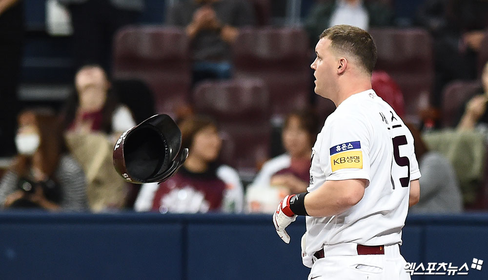 [엑스포츠뉴스 고척, 박지영 기자] 7일 오후 서울 구로구 고척스카이돔에서 열린 '2019 신한은행 MY CAR KBO 포스트시즌' LG 트윈스와 키움 히어로즈의 준플레이오프 2차전 경기, 1회말 2사 키움 샌즈가 헛스윙 삼진으로 물러나며 아쉬워하고 있다.