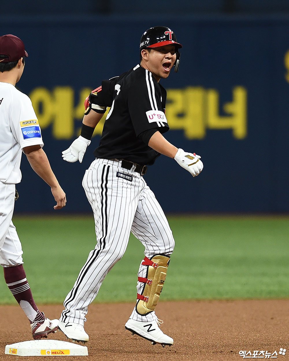 [엑스포츠뉴스 고척, 박지영 기자] 7일 오후 서울 구로구 고척스카이돔에서 열린 '2019 신한은행 MY CAR KBO 포스트시즌' LG 트윈스와 키움 히어로즈의 준플레이오프 2차전 경기, 1회초 1사 LG 김민성이 2루타를 때려낸 뒤 환호하고 있다.