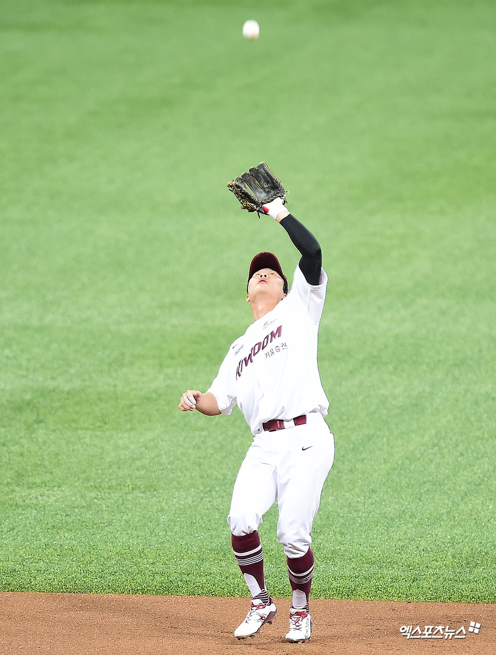 [엑스포츠뉴스 고척, 김한준 기자] 7일 오후 서울 구로구 고척스카이돔에서 열린 '2019 신한은행 MY CAR KBO 포스트시즌' LG 트윈스와 키움 히어로즈의 준플레이오프 2차전 경기, 2회초 1사 키움 김하성이 LG 유강남의 타구를 바라보고 있다.