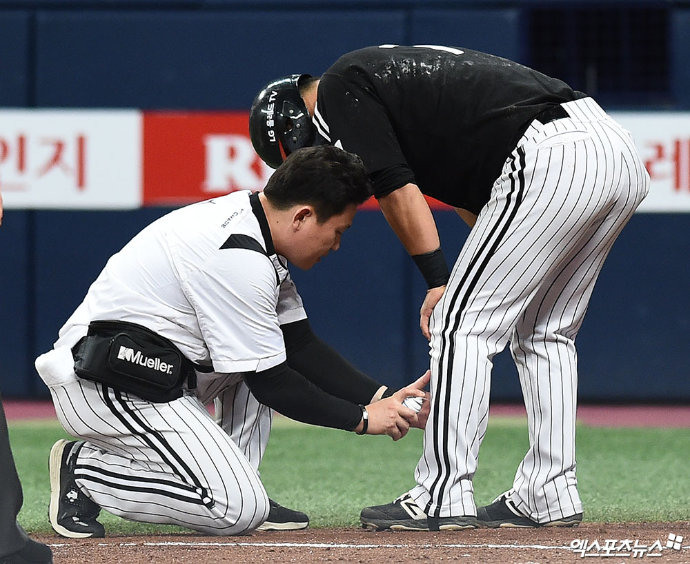 [엑스포츠뉴스 고척, 박지영 기자] 7일 오후 서울 구로구 고척스카이돔에서 열린 '2019 신한은행 MY CAR KBO 포스트시즌' LG 트윈스와 키움 히어로즈의 준플레이오프 2차전 경기, 2회초 2사 LG 정주현이 몸에 맞는 볼로 출루하며 통증을 호소하고 있다.