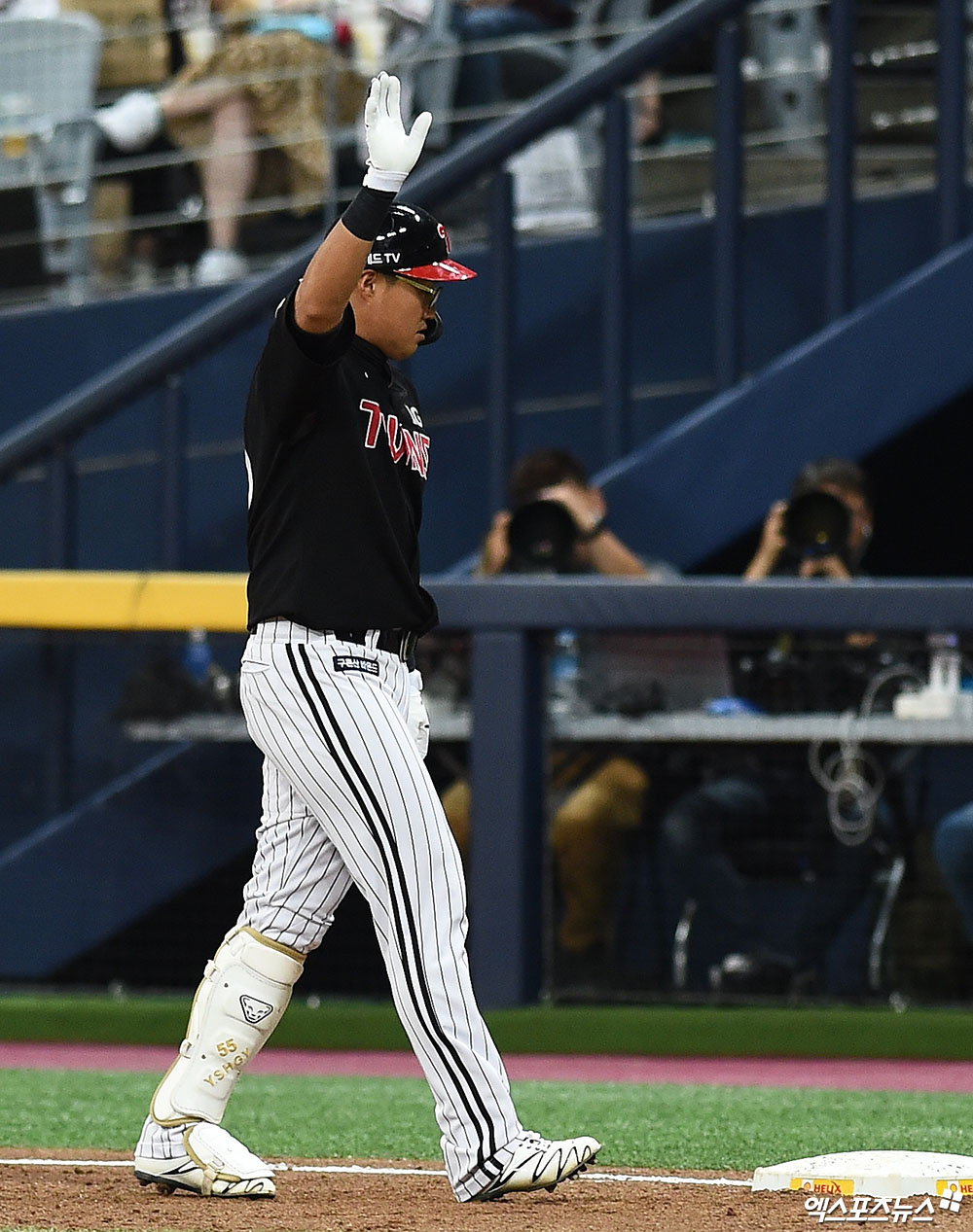 [엑스포츠뉴스 고척, 박지영 기자] 7일 오후 서울 구로구 고척스카이돔에서 열린 '2019 신한은행 MY CAR KBO 포스트시즌' LG 트윈스와 키움 히어로즈의 준플레이오프 2차전 경기, 3회초 1사 LG 채은성이 안타를 때려낸 뒤 1루에서 세리머니를 하고 있다.