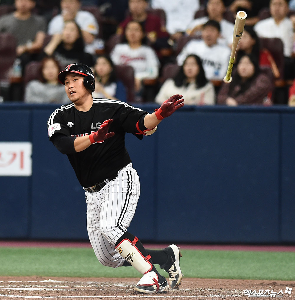 [엑스포츠뉴스 고척, 박지영 기자] 7일 오후 서울 구로구 고척스카이돔에서 열린 '2019 신한은행 MY CAR KBO 포스트시즌' LG 트윈스와 키움 히어로즈의 준플레이오프 2차전 경기, 3회초 1사 1,2루 LG 유강남이 적시 2루타를 때려내고 있다.