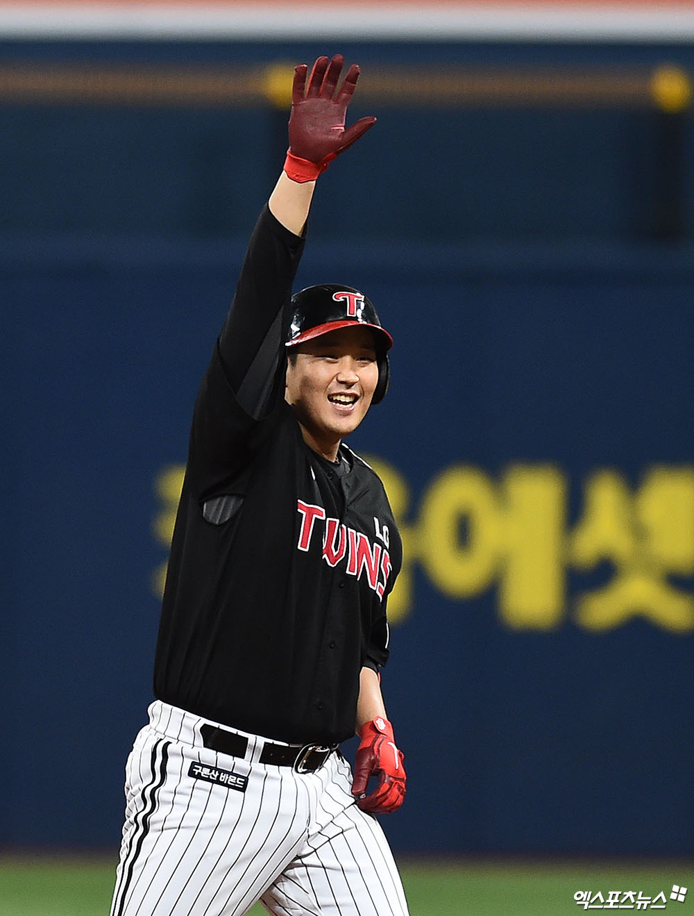 [엑스포츠뉴스 고척, 박지영 기자] 7일 오후 서울 구로구 고척스카이돔에서 열린 '2019 신한은행 MY CAR KBO 포스트시즌' LG 트윈스와 키움 히어로즈의 준플레이오프 2차전 경기, 3회초 1사 1,2루 LG 유강남이 적시 2루타를 때려낸 뒤 2루에서 환호하고 있다.