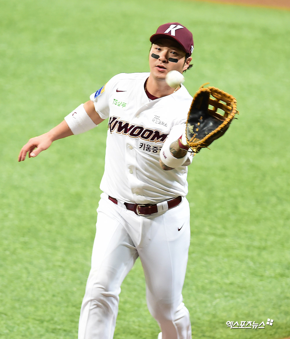 [엑스포츠뉴스 고척, 김한준 기자] 7일 오후 서울 구로구 고척스카이돔에서 열린 '2019 신한은행 MY CAR KBO 포스트시즌' LG 트윈스와 키움 히어로즈의 준플레이오프 2차전 경기, 4회초 무사 1루 키움 박병호가 LG 김민성의 번트 타구를 잡아내고 있다.