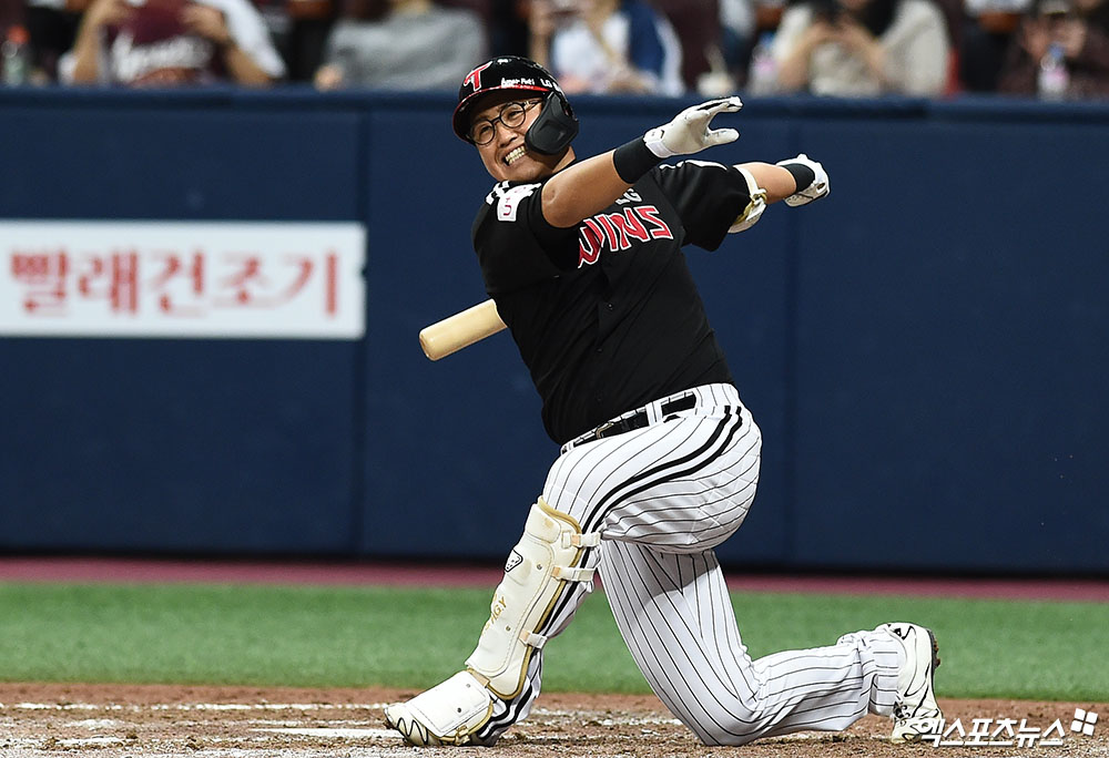 [엑스포츠뉴스 고척, 박지영 기자] 7일 오후 서울 구로구 고척스카이돔에서 열린 '2019 신한은행 MY CAR KBO 포스트시즌' LG 트윈스와 키움 히어로즈의 준플레이오프 2차전 경기, 5회초 무사 LG 선두타자 채은성이 헛스윙 삼진으로 물러나고 있다.