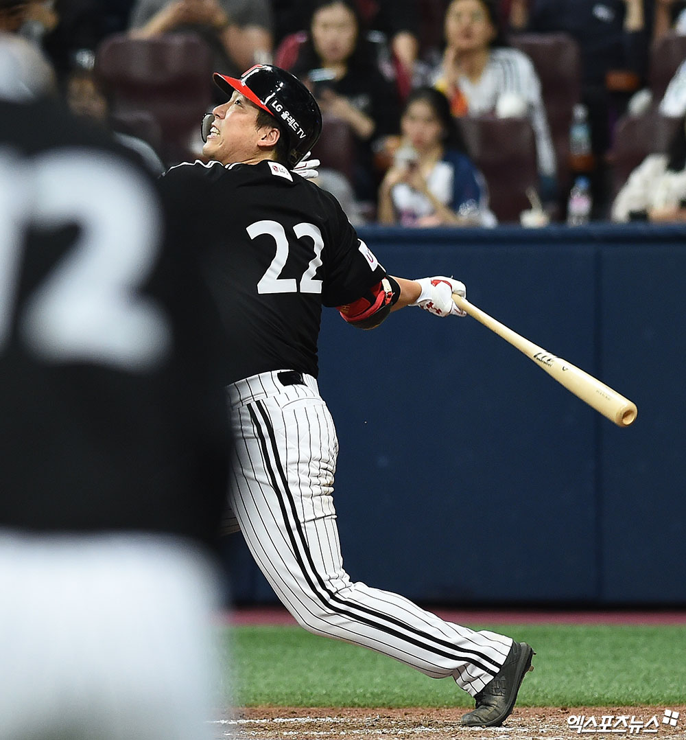 [엑스포츠뉴스 고척, 박지영 기자] 7일 오후 서울 구로구 고척스카이돔에서 열린 '2019 신한은행 MY CAR KBO 포스트시즌' LG 트윈스와 키움 히어로즈의 준플레이오프 2차전 경기, 6회초 2사 만루 LG 김현수가 타격하고 있다. 결과는 좌익수 플라이 아웃.