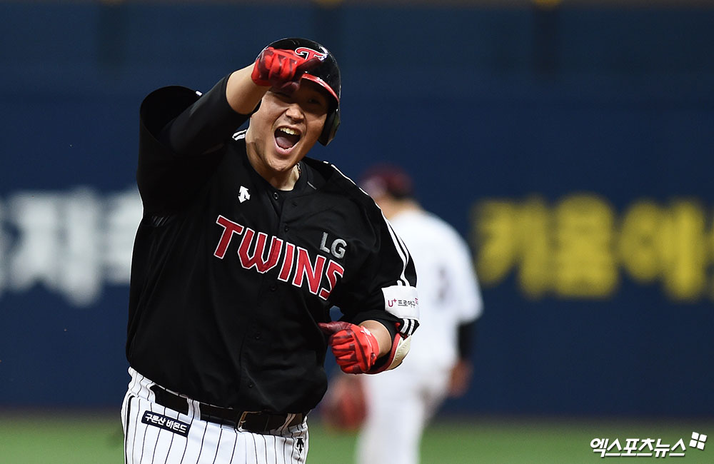[엑스포츠뉴스 고척, 박지영 기자] 7일 오후 서울 구로구 고척스카이돔에서 열린 '2019 신한은행 MY CAR KBO 포스트시즌' LG 트윈스와 키움 히어로즈의 준플레이오프 2차전 경기, 7회초 2사 LG 유강남이 솔로홈런을 터뜨린 뒤 세리머니를 하고 있다.