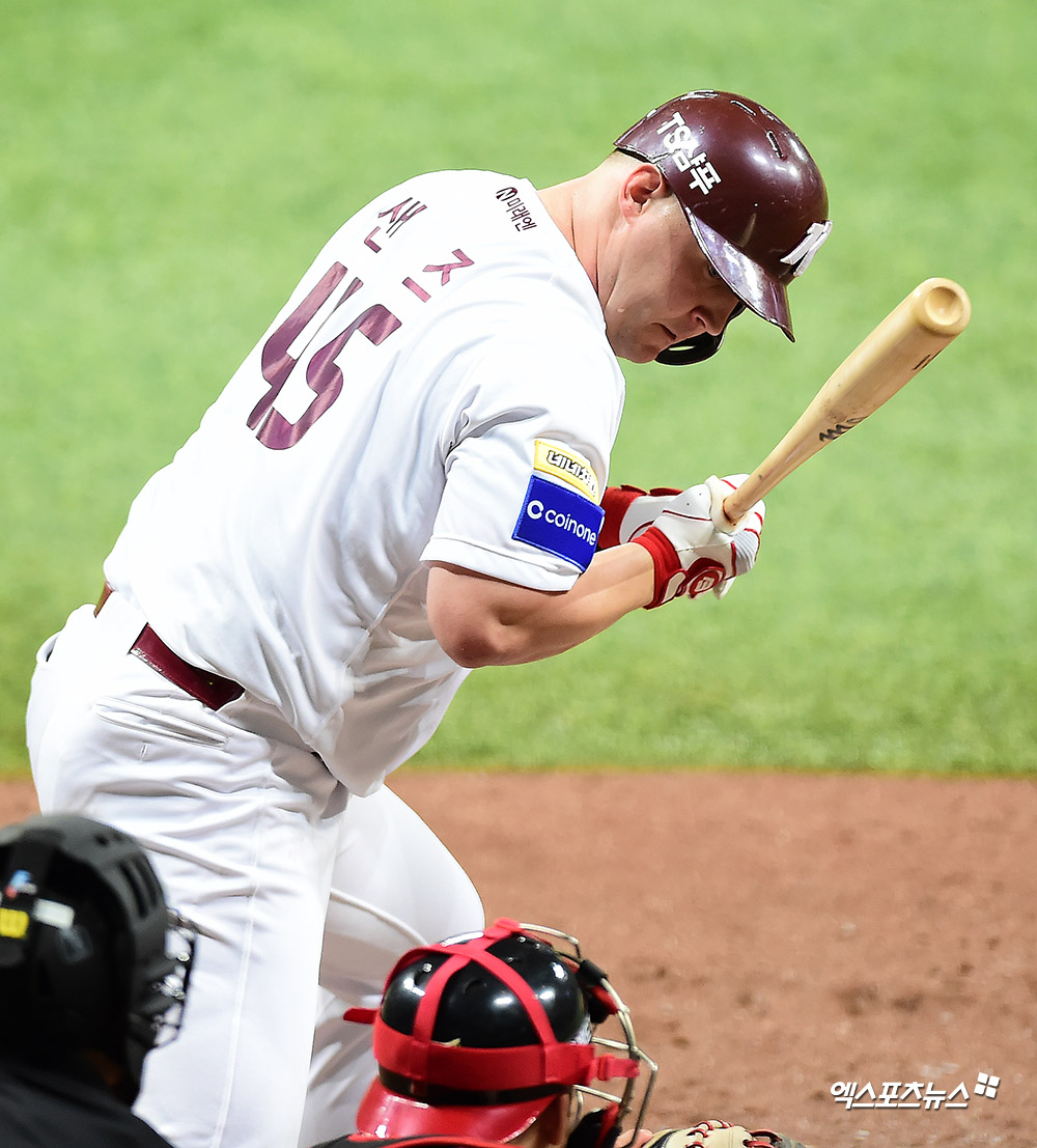 [엑스포츠뉴스 고척, 김한준 기자] 7일 오후 서울 구로구 고척스카이돔에서 열린 '2019 신한은행 MY CAR KBO 포스트시즌' LG 트윈스와 키움 히어로즈의 준플레이오프 2차전 경기, 8회말 무사 1루 키움 샌즈가 루킹 삼진을 당하고 있다.