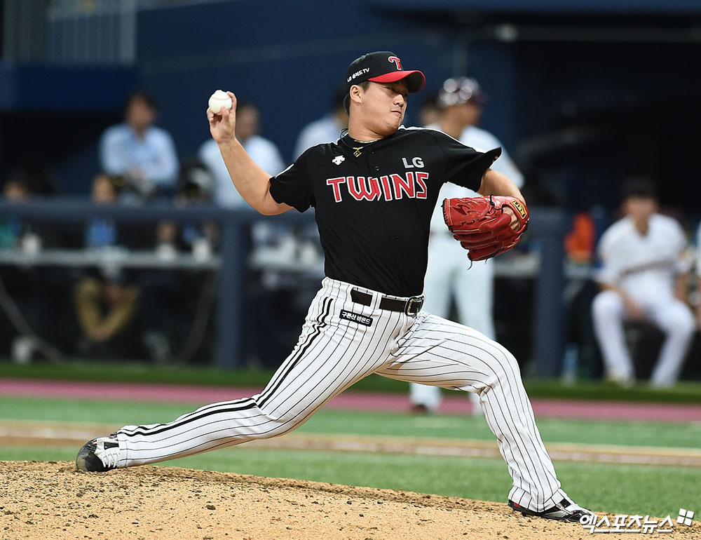 [엑스포츠뉴스 고척, 박지영 기자] 7일 오후 서울 구로구 고척스카이돔에서 열린 '2019 신한은행 MY CAR KBO 포스트시즌' LG 트윈스와 키움 히어로즈의 준플레이오프 2차전 경기, 9회말 무사 LG 고우석이 역투하고 있다.