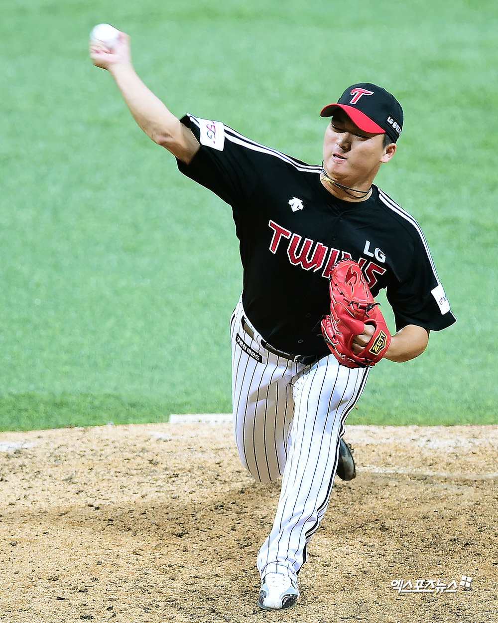 [엑스포츠뉴스 고척, 김한준 기자] 7일 오후 서울 구로구 고척스카이돔에서 열린 '2019 신한은행 MY CAR KBO 포스트시즌' LG 트윈스와 키움 히어로즈의 준플레이오프 2차전 경기, 9회말 LG 고우석이 공을 힘차게 던지고 있다.