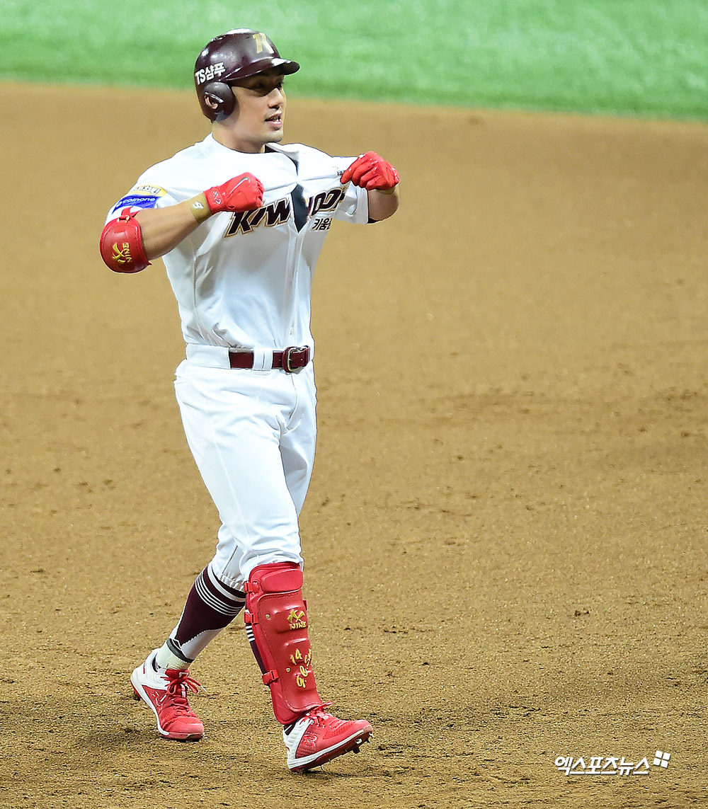 [엑스포츠뉴스 고척, 김한준 기자] 7일 오후 서울 구로구 고척스카이돔에서 열린 '2019 신한은행 MY CAR KBO 포스트시즌' LG 트윈스와 키움 히어로즈의 준플레이오프 2차전 경기, 9회말 2사 3루 키움 서건창이 동점 적시타를 날린 후 기뻐하고 있다.