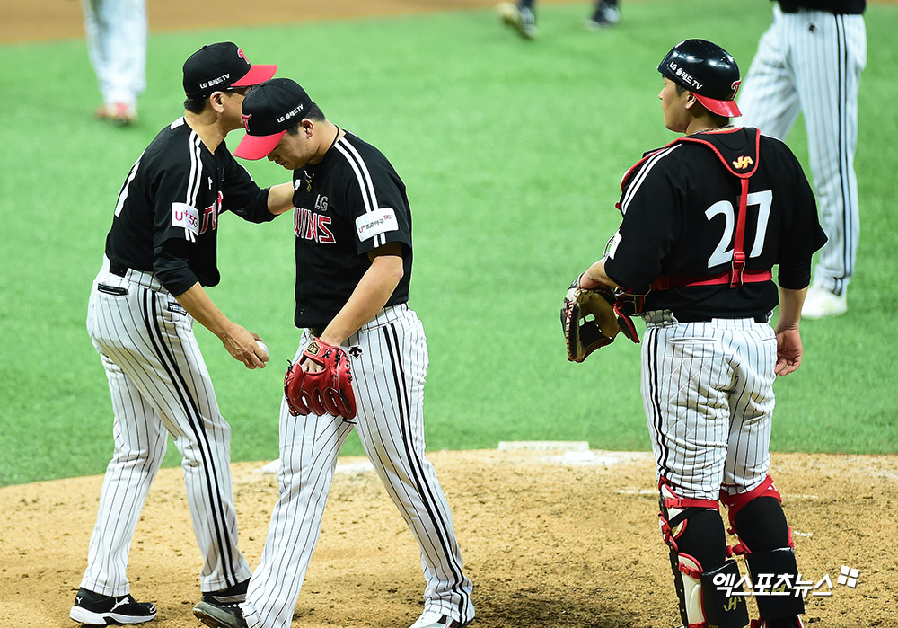 [엑스포츠뉴스 고척, 김한준 기자] 7일 오후 서울 구로구 고척스카이돔에서 열린 '2019 신한은행 MY CAR KBO 포스트시즌' LG 트윈스와 키움 히어로즈의 준플레이오프 2차전 경기, 9회말 2사 만루 LG 고우석이 마운드를 내려가고 있다.