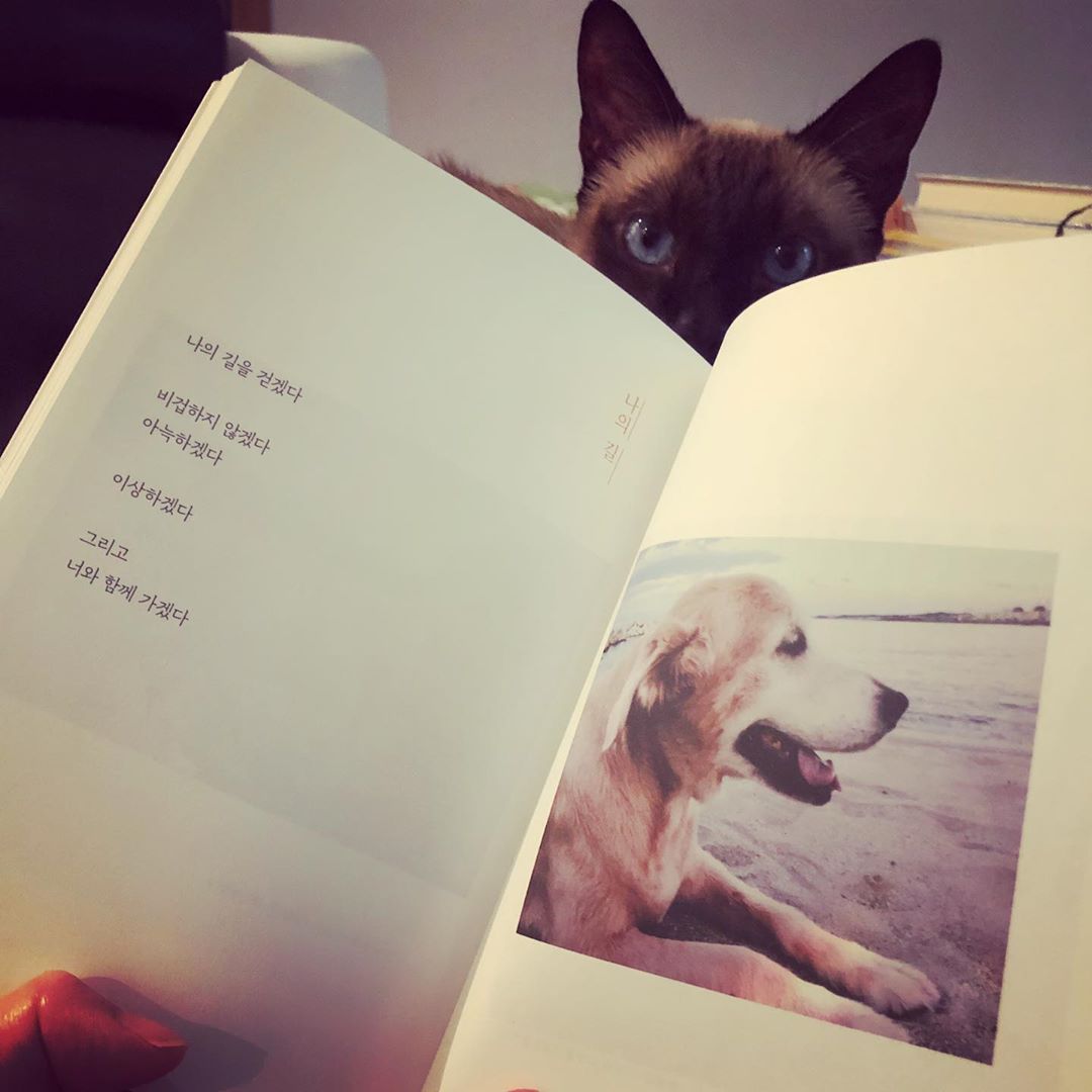 사진은 구혜선의 에세이집 '나는 너의 반려동물'의 한 페이지를 찍은 것으로, 책 뒤편으로 고양이가 보인다.