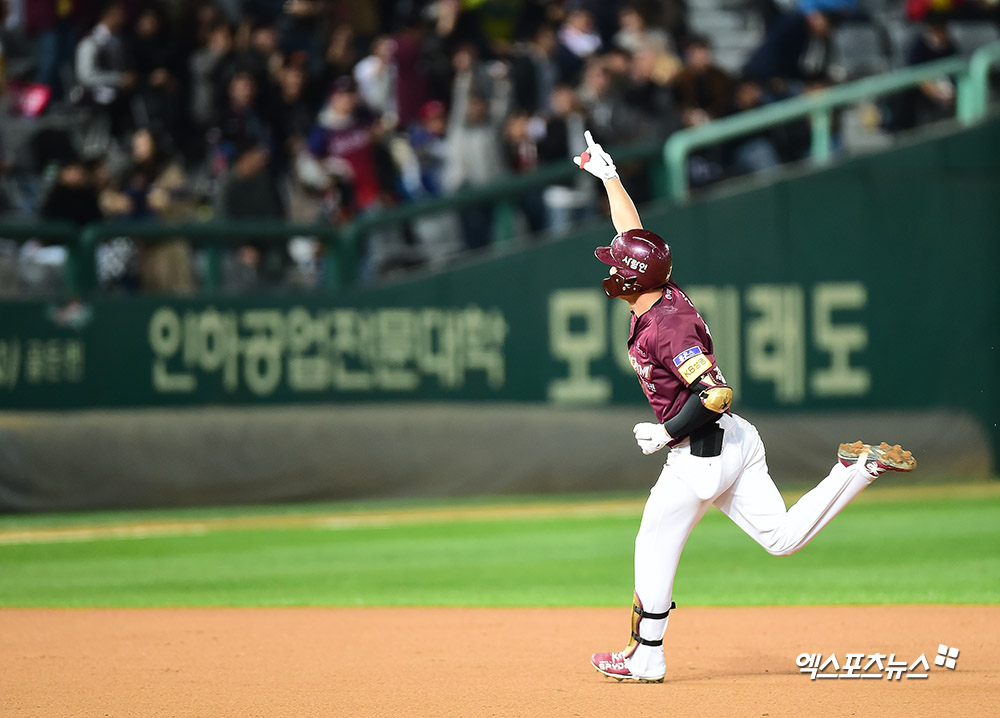 [엑스포츠뉴스 인천, 김한준 기자] 15일 오후 인천SK행복드림구장에서 열린 '2019 신한은행 MY CAR KBO 포스트시즌' 키움 히어로즈와 SK 와이번스의 플레이오프 2차전 경기, 5회초 무사 1루 키움 김하성이 투런 홈런을 날린 후 그라운드를 돌고 있다.