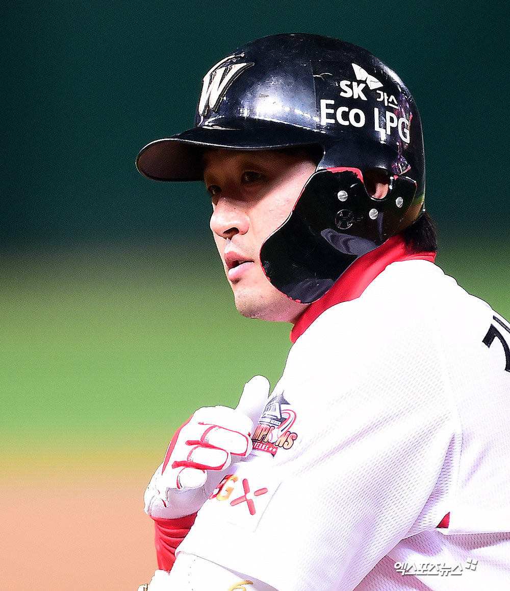 [엑스포츠뉴스 인천, 김한준 기자] 15일 오후 인천SK행복드림구장에서 열린 '2019 신한은행 MY CAR KBO 포스트시즌' 키움 히어로즈와 SK 와이번스의 플레이오프 2차전 경기, 7회말 SK 김성현이 좌전안타를 날린 후 세리머니를 하고 있다.