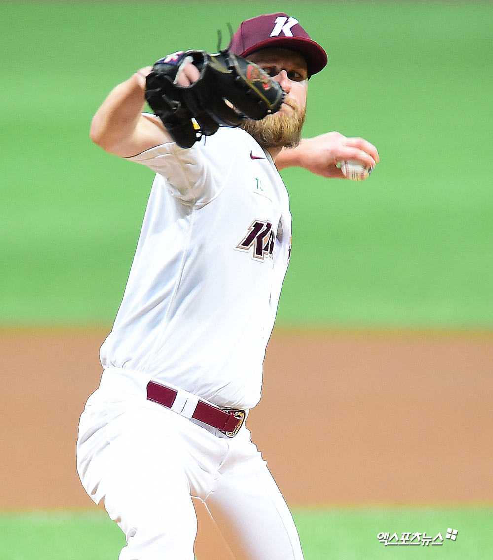 [엑스포츠뉴스 고척, 김한준 기자] 17일 오후 서울 구로구 고척스카이돔에서 열린 '2019 신한은행 MY CAR KBO 포스트시즌' SK 와이번스와 키움 히어로즈의 플레이오프 3차전 경기, 1회초 키움 선발투수 요키시가 공을 힘차게 던지고 있다.